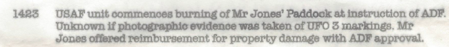 This is also the first I am hearing of the controlled burning operation of Cornelius Jones' neighbouring farm by the USAF. There was indeed a Cornelius Jones who owned a farm situated east of the College in the 1960s, but I cannot find any information confirming the burning of his paddock. The report times this incident as occurring in the afternoon after the student population had dissipated, so it is plausible the student witnesses missed it.
