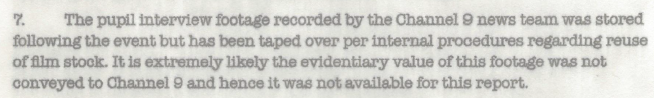 Channel 9 and their media team appear in this report albeit with little detail. We are only given the military personnel's instruction to them to leave after interviewing a small pool of students. The author of this report alleges the interview film was initially preserved but later taped over. There's no mention of whether the material aired.